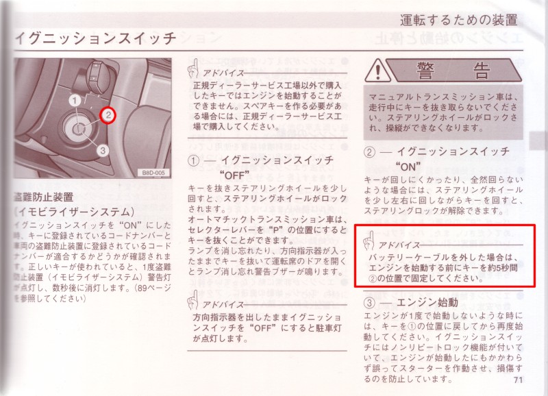 バッテリを外すと各装備品(パワーウィンドウのワンタッチ機能、セイフティ機能、エンジン制御システム など)のメモリー機能が消去されますのでセットし直しが必要です。これに関しましては、車載の取扱説明書 (1998年式のAudi A4、Audi A4 Avantの取扱説明書なら、パワーウィンドウはP.51(←クリック)に、 エンジン制御はP.71(←クリック) に掲載されている)に全て掲載されておりますので、そちらを参照下さい。それと、オーディオのチューナーの 選局ボタンの設定もリセットされます。時計も合わせ直しが必要。あと、トリップメーターがZEROに なりました。これは控えてなかったので大失敗。燃費計算ができません。