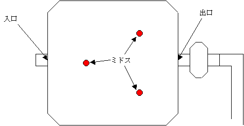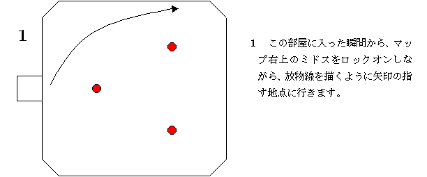 3 右上にいるミドスをやっつけたら、今度は右下にいるミドスを倒しに左の図に矢印のところまで移動します。そして、2と同じ方法でマップ右下にいるミドスを倒しましょう。