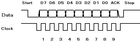 | 受信側は、クロックの立ち上がりエッジにて データを1ビットずつ取り込みます。 データはMSBから送出され、1データ 8ビットで構成されています。 8ビットデータの次の1ビットは必ず acknowledge(ACK)ビット が付加され、 機器間のシリアル通信のハンドシェークに 用います。 |