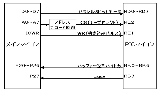 PICマイコン側では、常にポートに空きメモリー量とBusyを出力しておき、メインマイコン