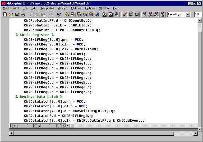 ロジックはADHL言語・VHDL言語で作成し、デバッグはMAX+PLUSUのロジックシュミレーターで行います。
