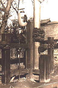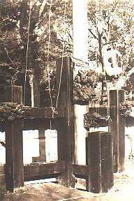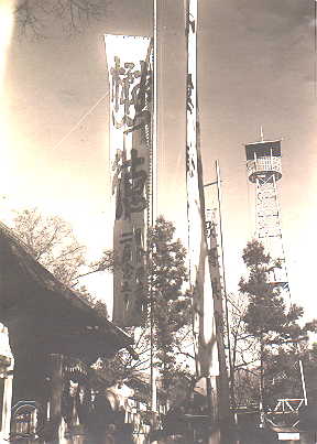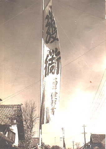 左の写真は南(平野さん宅の横)に立てた幟で、右が北(天神社横)に立てた幟。 天神社の橋のたもとにあった火の見やぐらに注目。