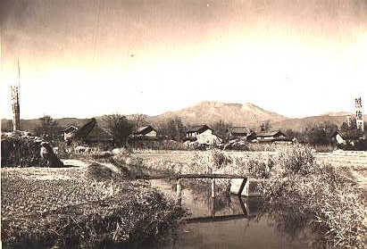 権五郎川の大曲がりの先から撮った写真です。 よく晴れた秋の日だったようですね。飯綱山がきれいに見えます。 権五郎川の様子は今と全く違います。S字型にカーブしています。 橋は、橋脚はありますが角材を渡しただけですね。